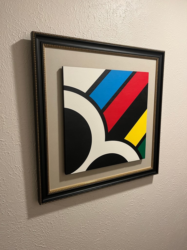 These motifs will register in any cycling enthusiasts retina. Indications of iconic cycling brands that have made their mark in our hearts and minds. These works are 12″ x 12″ acrylic lacquer paint on Baltic Birch then offset mounted to a frame set up. Each shape is individually cut, painted and reassembled to a back plate. The natural wood grain pops and provides a nice finished texture. (more motifs in the works)